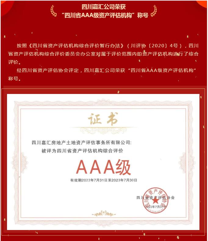 四川嘉匯公司榮獲“四川省AAA級(jí)資產(chǎn)評(píng)估機(jī)構(gòu)”稱號(hào)!